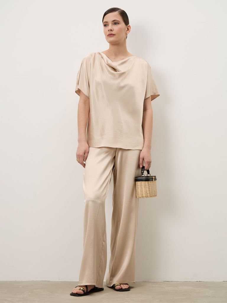 Свободный силуэт с мягкой драпировкой у горловины. Линия плеча расслабленная, без жёсткой геометрии. Минималистичный крой делает модель универсальной и устойчивой к смене трендов.
