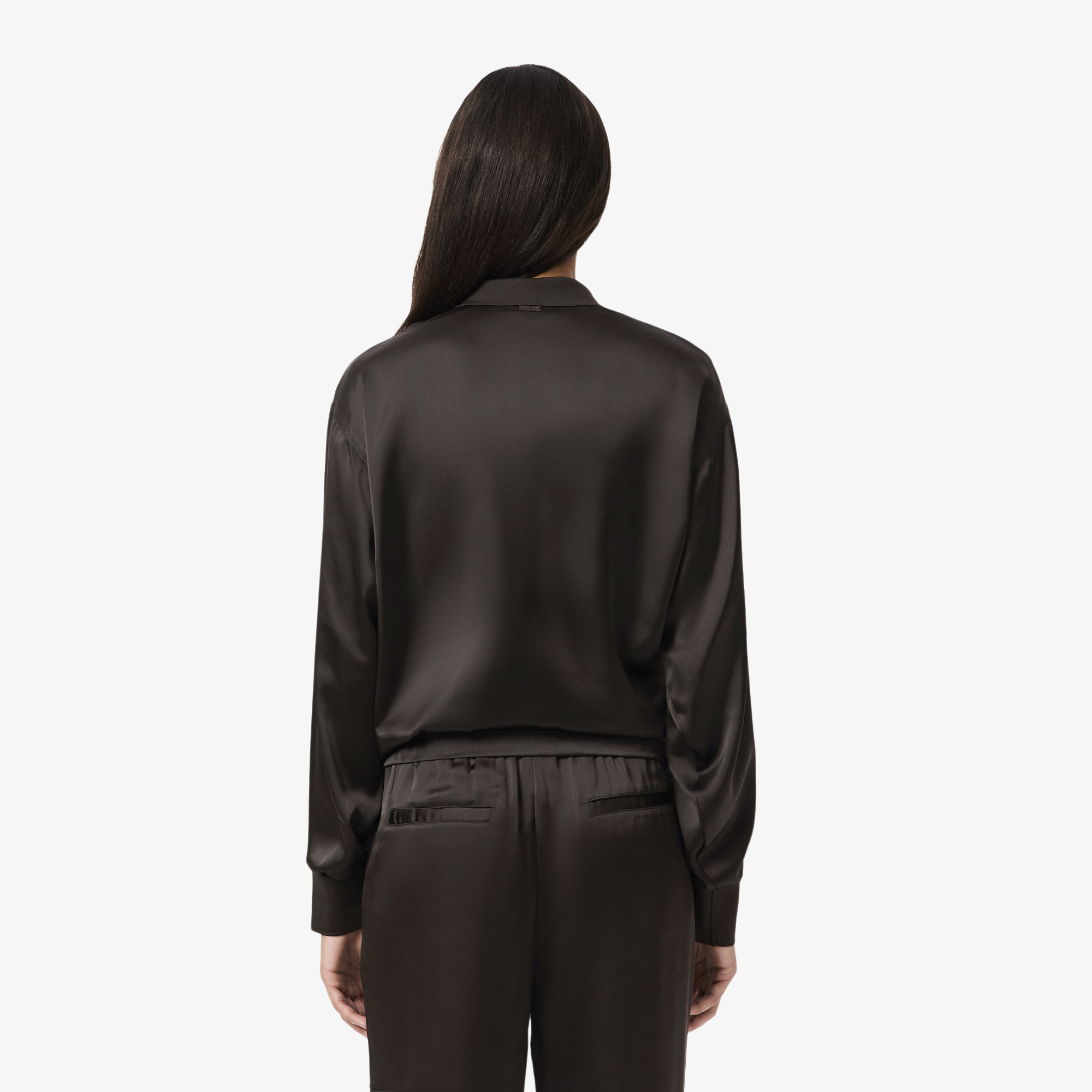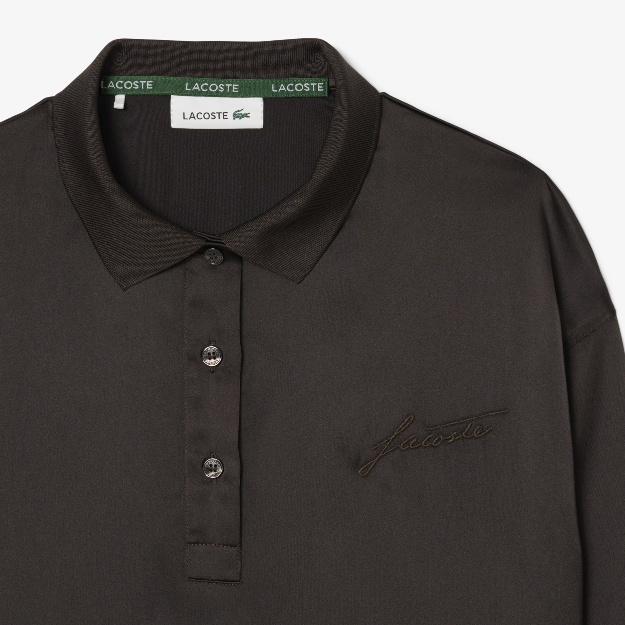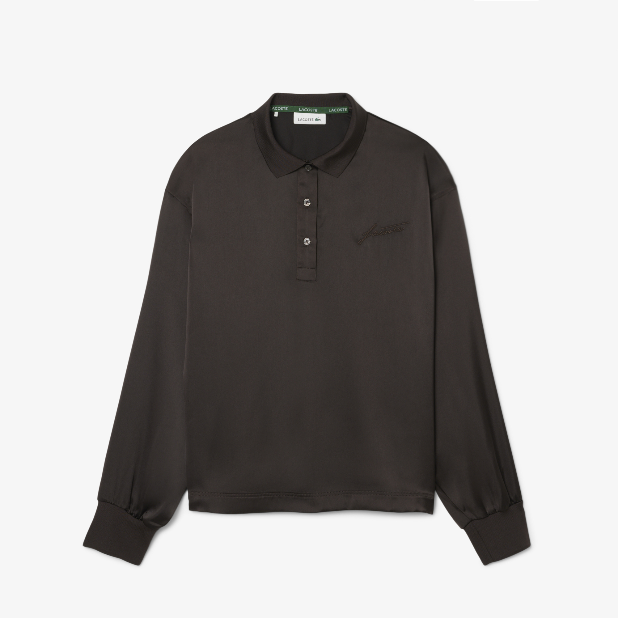 Атласная рубашка поло Oversize с длинными рукавами \ Переработанный полиэфирный атлас с ограниченным использованием сырья\ Вышитая подпись René Lacoste на груди \ Воротник и манжеты в рубчик \ Вышитый логотип на груди \ Облегающий крой Oversize. Выберите