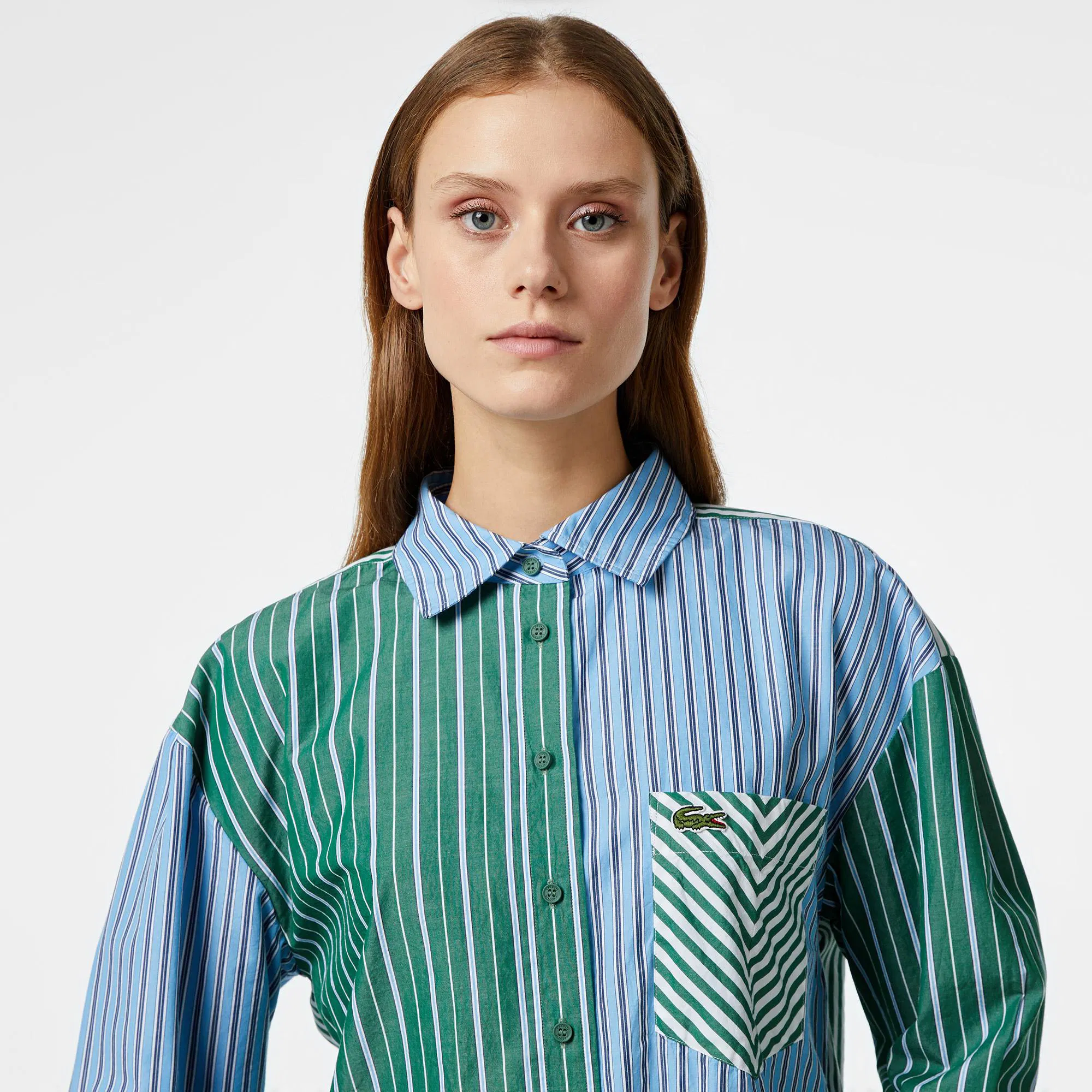 Классический воротник\спущенная линия плеч\контрастная расцветка\накладной карман на груди\логотип на груди\материал: 70% хлопок 30% лиоцелл\рост модели 174 см, размер одежды 36