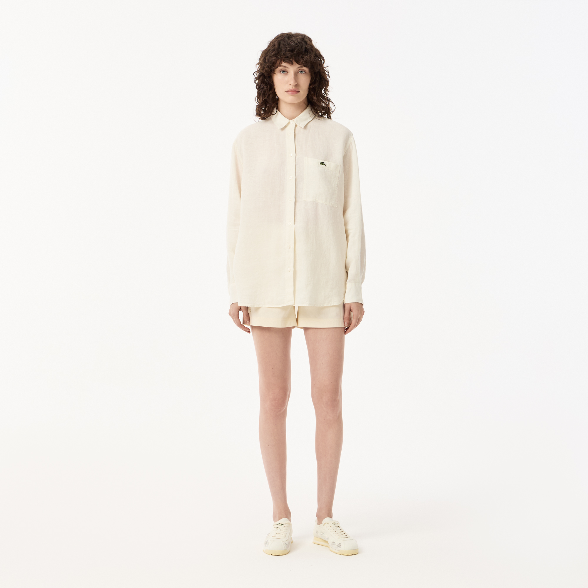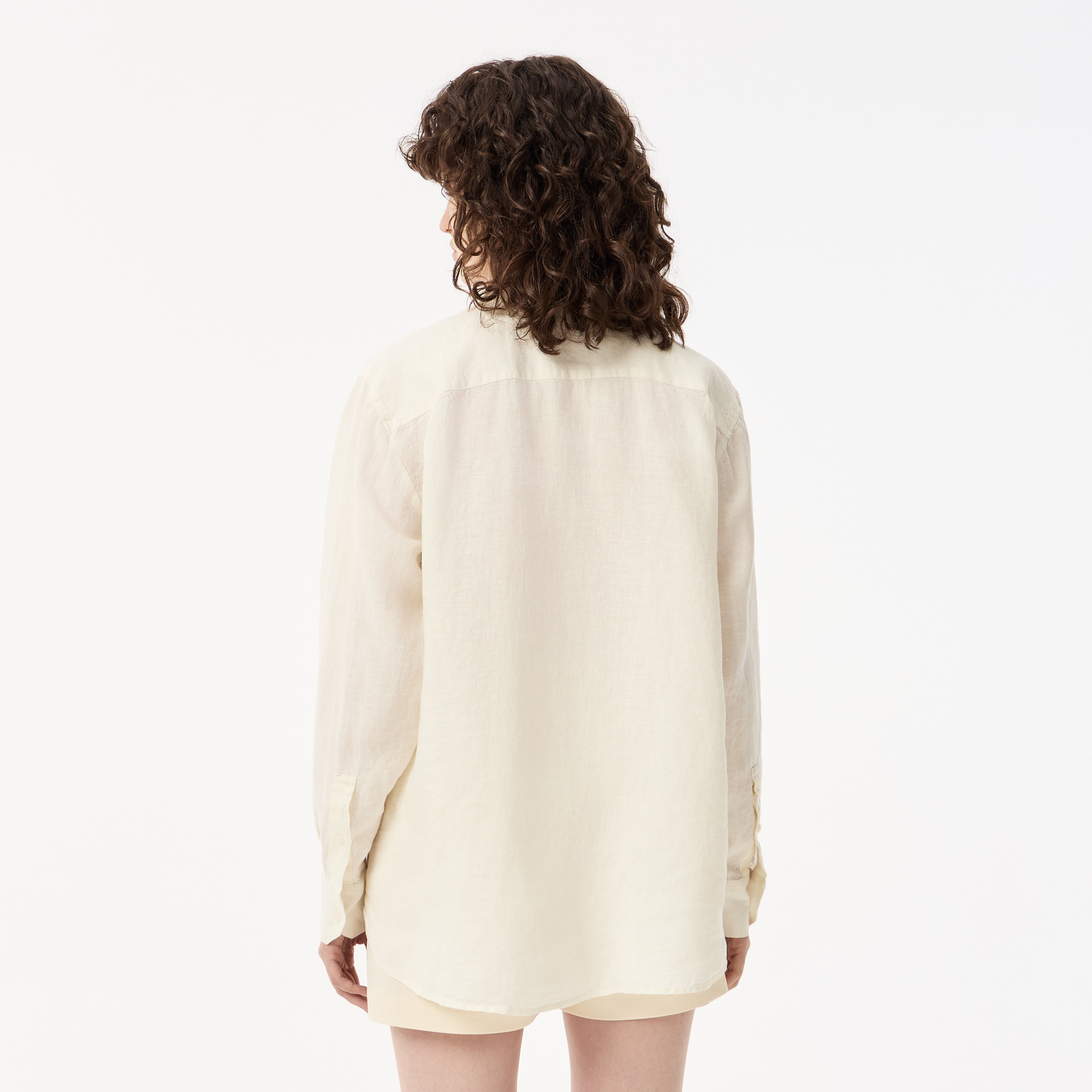 Льняная рубашка в полоску Oversize \ Легкий, дышащий лен \ Oversize щедрого кроя со спущенными плечами \ Накладной карман на груди \ На нагрудном кармане с вышивкой в виде крокодила \ Материал: 100% лён