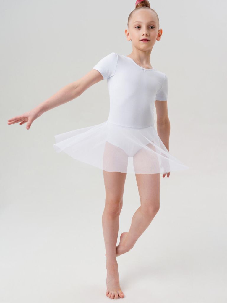 Белый гимнастический купальник боди с коротким рукавом и юбкой из сетки для девочки-подростка от PlayToday — комфорт, лёгкость и свобода движений для занятий спортом и творчеством.