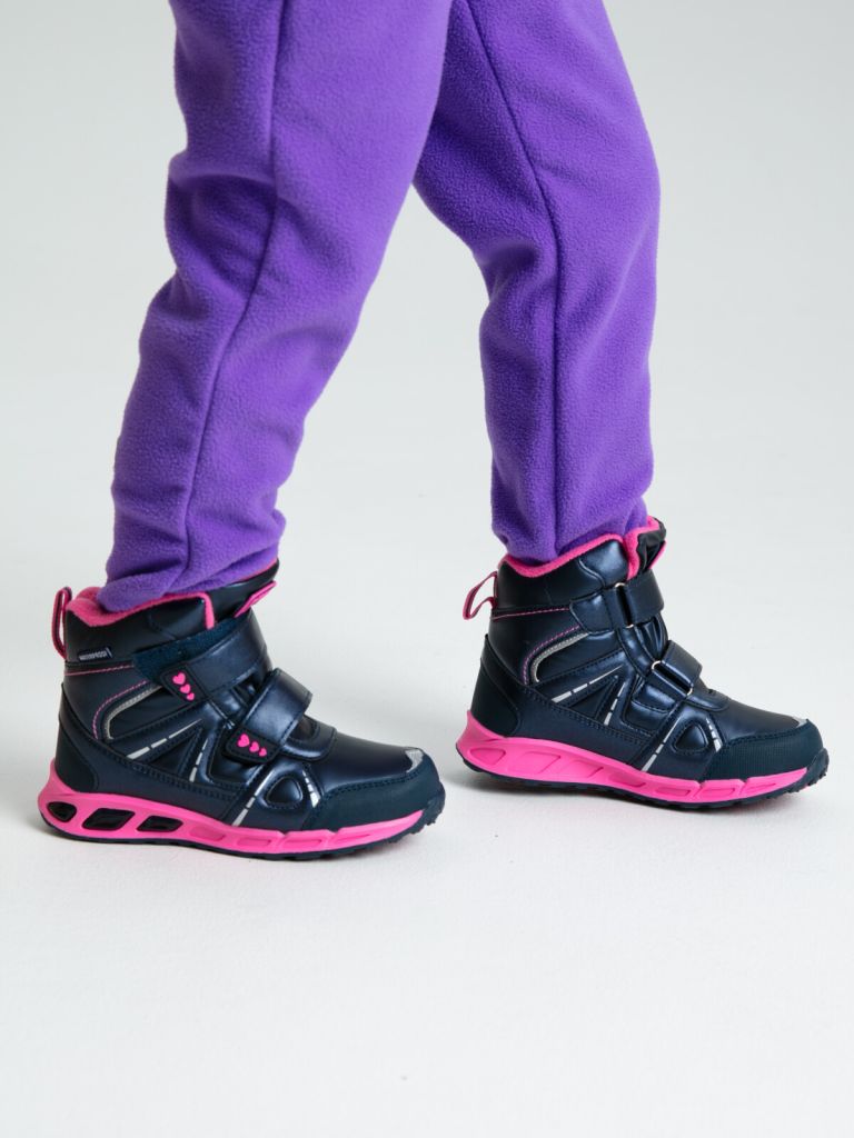 Конструкция верха изготовлена с использованием мембранных технологий. Усиленная защита носка и пятки специальными материалами. Подкладка и стелька выполнены из шерстяного меха 80%. Трехслойная стелька с фольгой, которая обеспечивает сохранение тепла в течение длительного времени. Формоустойчивый задник поддерживает стопу в правильном положении. Подошва имеет противоскользящий протектор. Удобная застежка-липучка. Модель со светодиодной подсветкой позволяет хорошо видеть ребенка даже в темное время суток. Рекомендованный температурный режим от 0°С до -20°С.