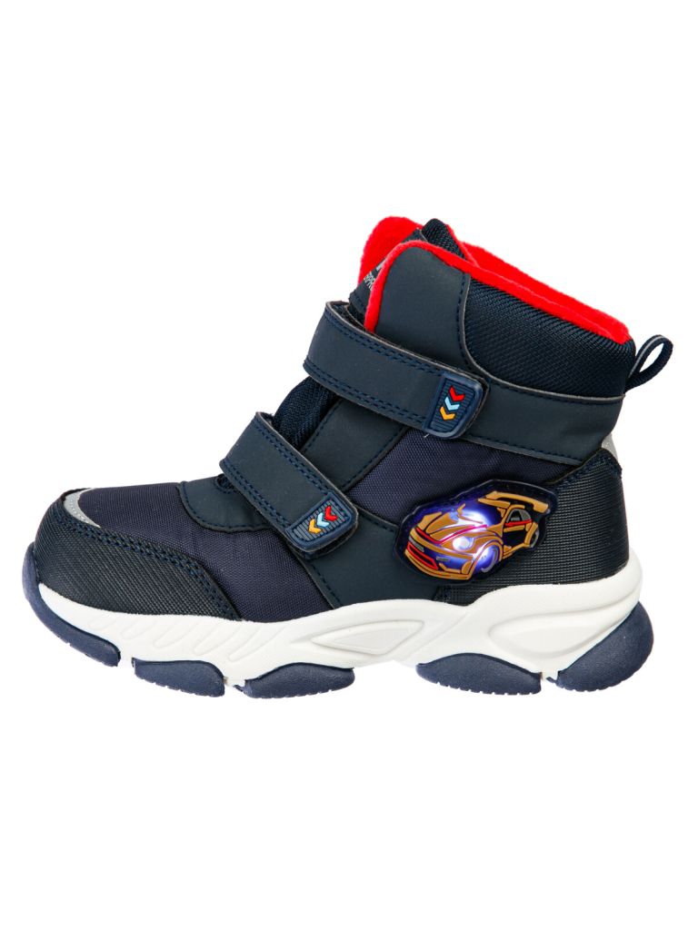Конструкция верха изготовлена с использованием мембранных технологий. Усиленная защита носка и пятки специальными материалами. Подкладка из мягкого флиса. Съемная стелька выполнена из материала c высоким содержанием валеной шерсти 50% и обладает высокими теплозащитными свойствами. Формоустойчивый задник поддерживает стопу в правильном положении. Подошва имеет противоскользящий протектор. Удобная застежка-липучка. Рекомендованный температурный режим от 0°С до -15°С. Модель со светодиодной подсветкой, что позволяет хорошо видеть ребенка даже в темное время суток.
