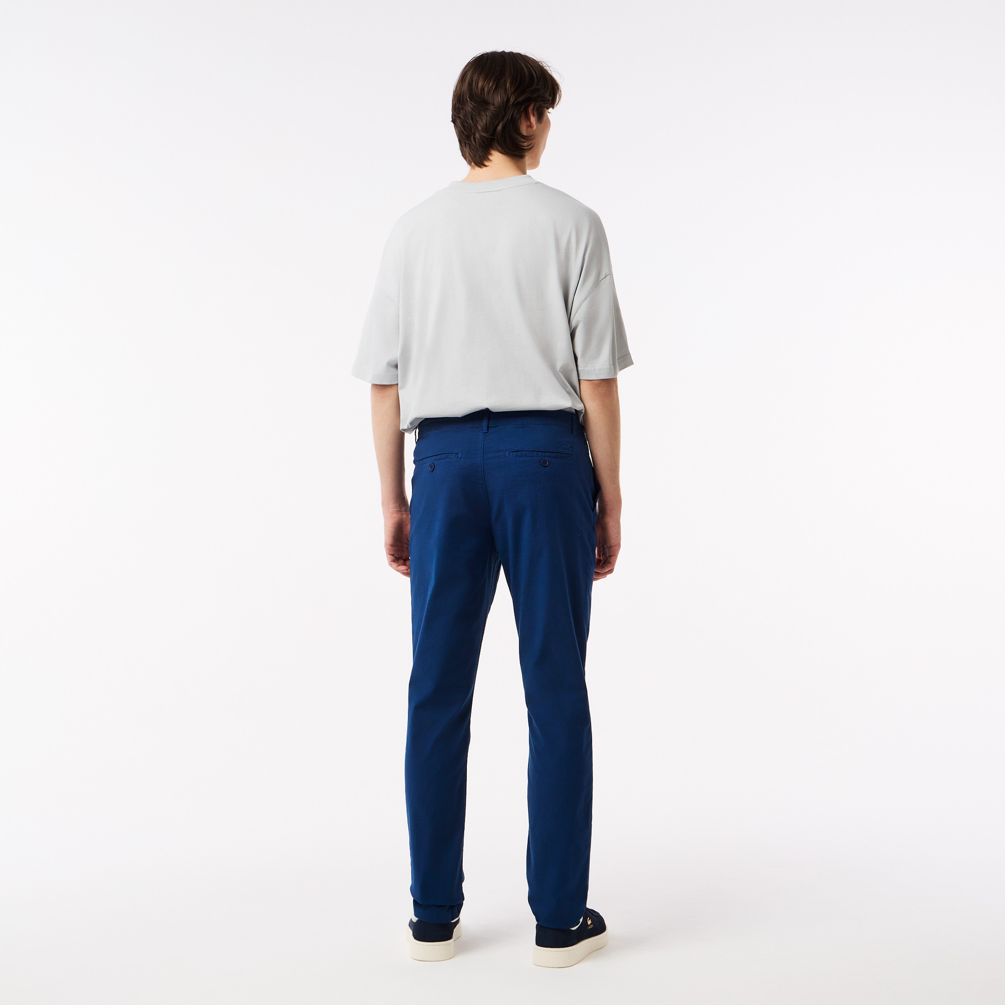 Застежка-молния с пуговицей и шлевками для ремня\Три кармана\Логотип в тон изделия сзади\Материал: верх-97% хлопок 3% эластан\Рост модели 186 см, размер одежды 40