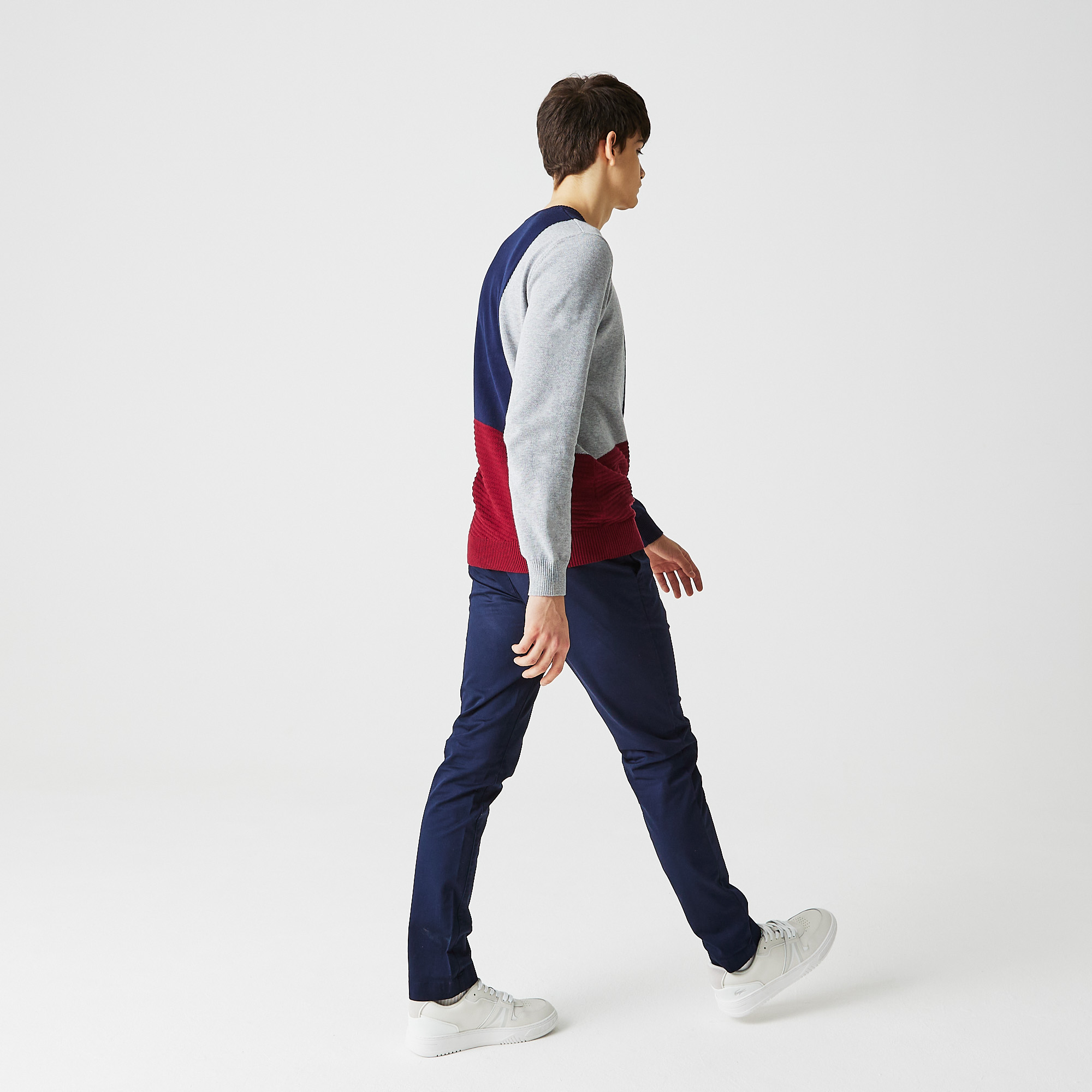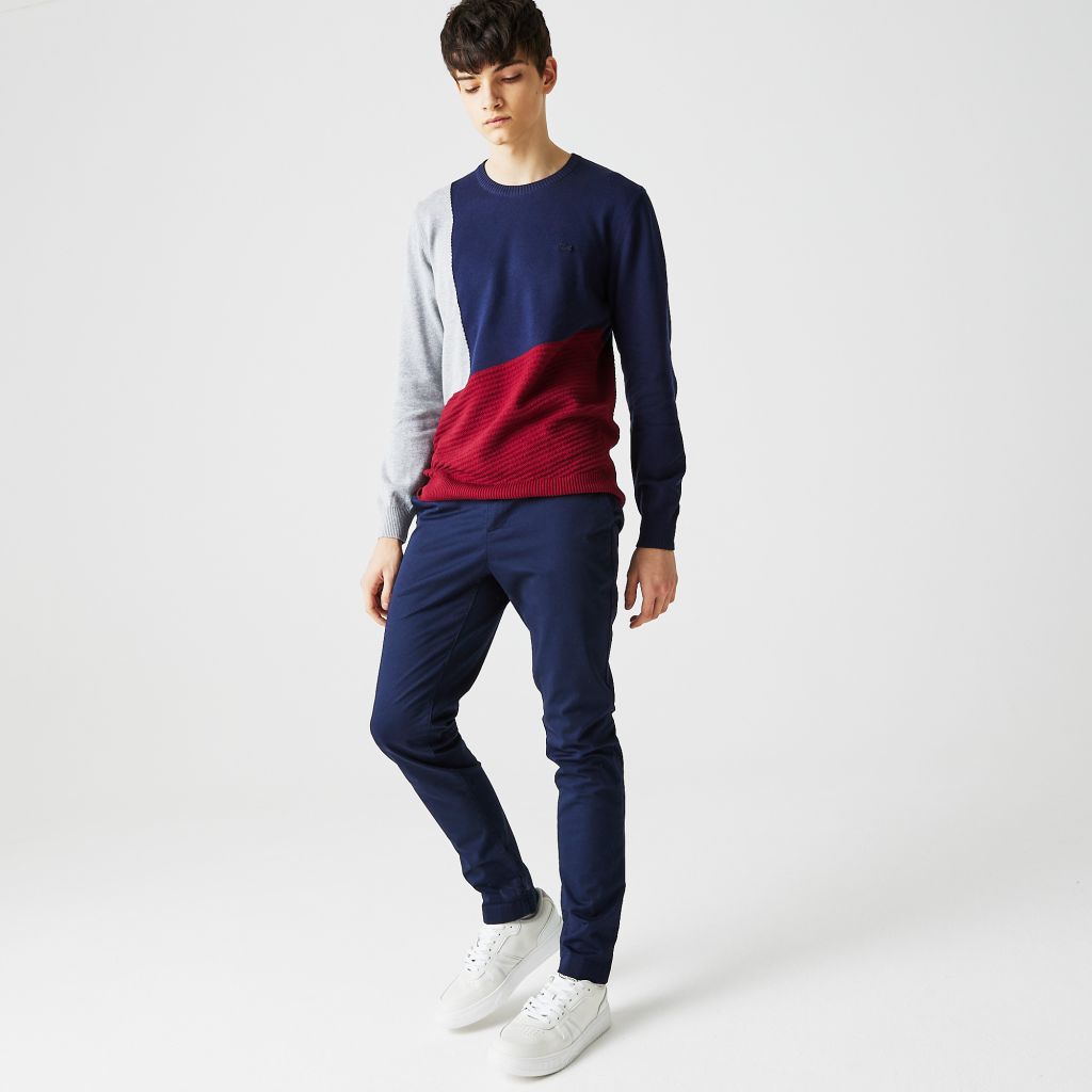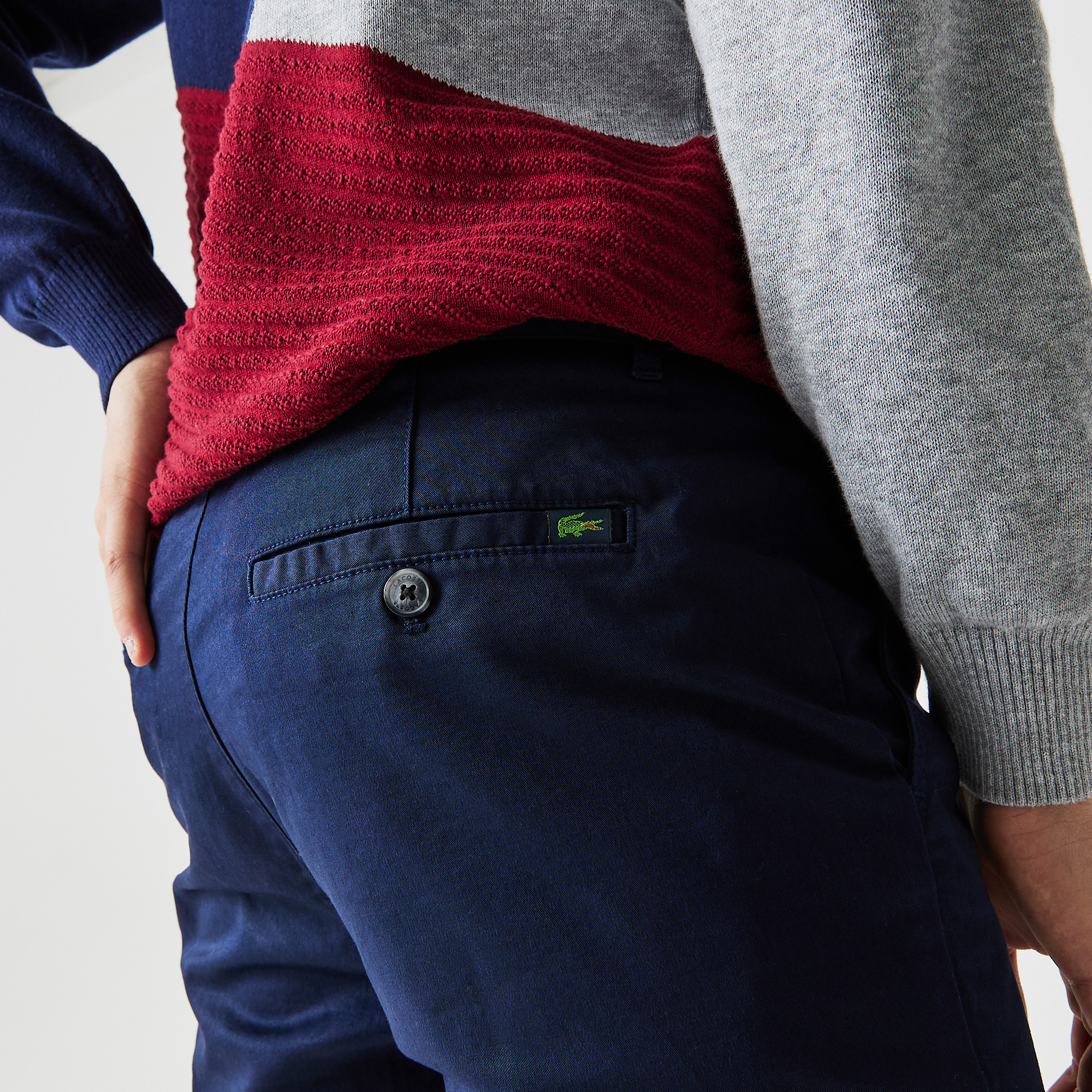Мужские брюки-чино из эластичного габардина Slim Fit \ Приталенный крой \ Одноцветный эластичный хлопковый габардин \ Боковые косые карманы и задние карманы без пуговиц \ Ширинка на молнии \ Тканая этикетка из крокодиловой кожи\ Материал: 98% хлопок 2% эл