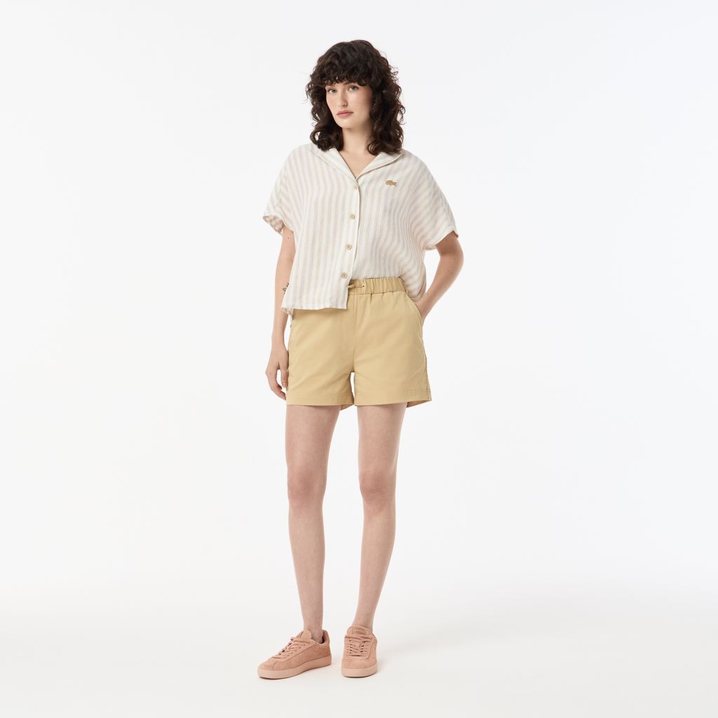 Пояс с регулируемой кулиской\Прорезные карманы\Напись "Rene Lacoste" сбоку\Логотип в тон изделия на нижнем крае\Материал: верх-67% хлопок 30% полиамид 3% эластан\Рост модели 174 см, размер одежды 36