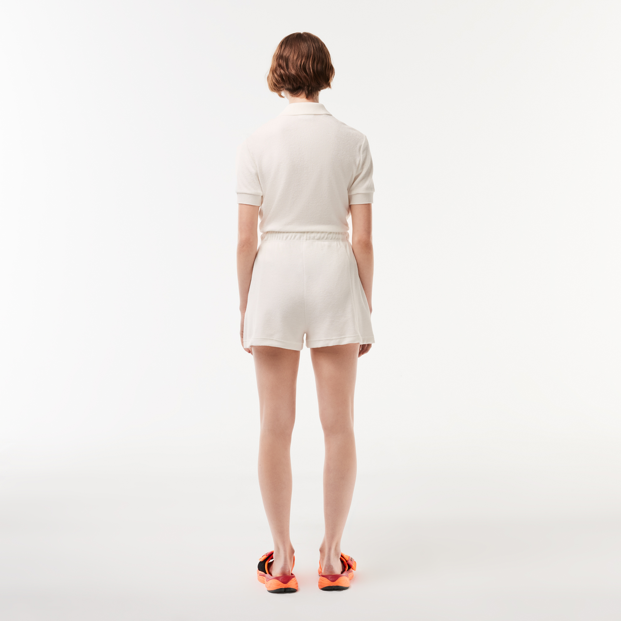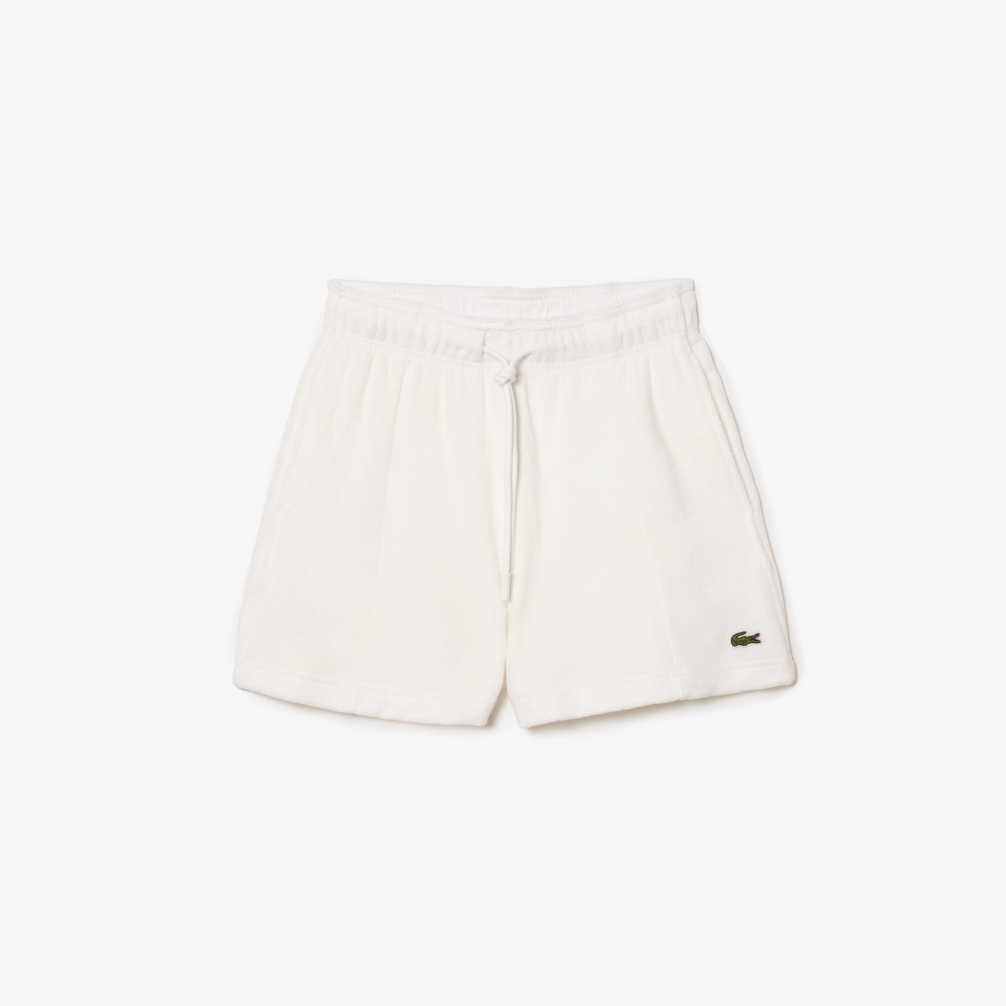 Женские махровые шорты из органического хлопка Lacoste \ Эластичная талия с завязками \ Боковые карманы \ Логотип спереди \ Переработанный полиэстер \ Органический хлопок \ Эластичный поял с кулиской\Прорезные карманы по бокам\Логотип в тон изделия\Матер