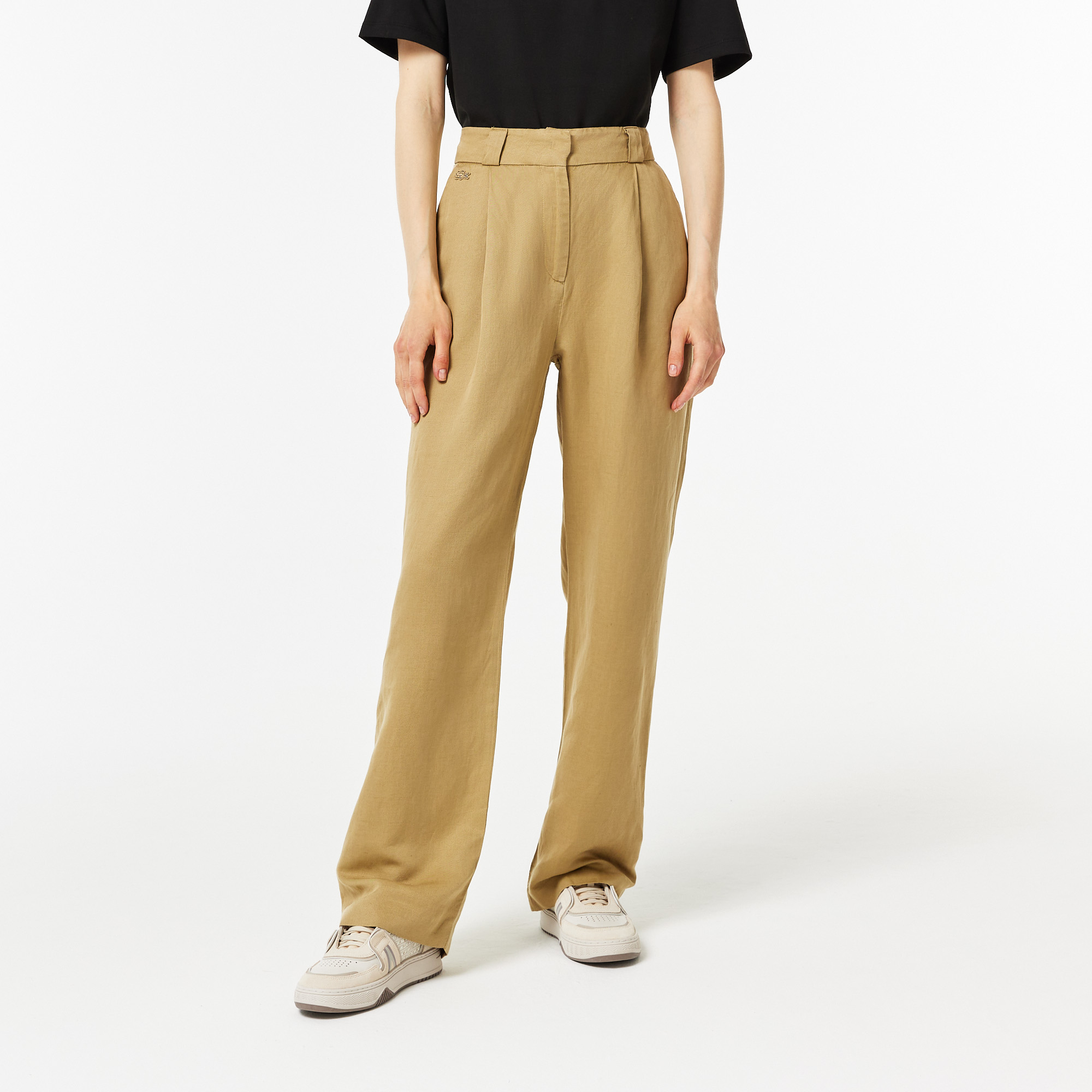 Брюки палаццо\Высокая талия\Прорезные карманы\Логотип в тон изделия\Материал: 55% лиоцелл 45% лен\Рост модели 174 см, размер одежды 36