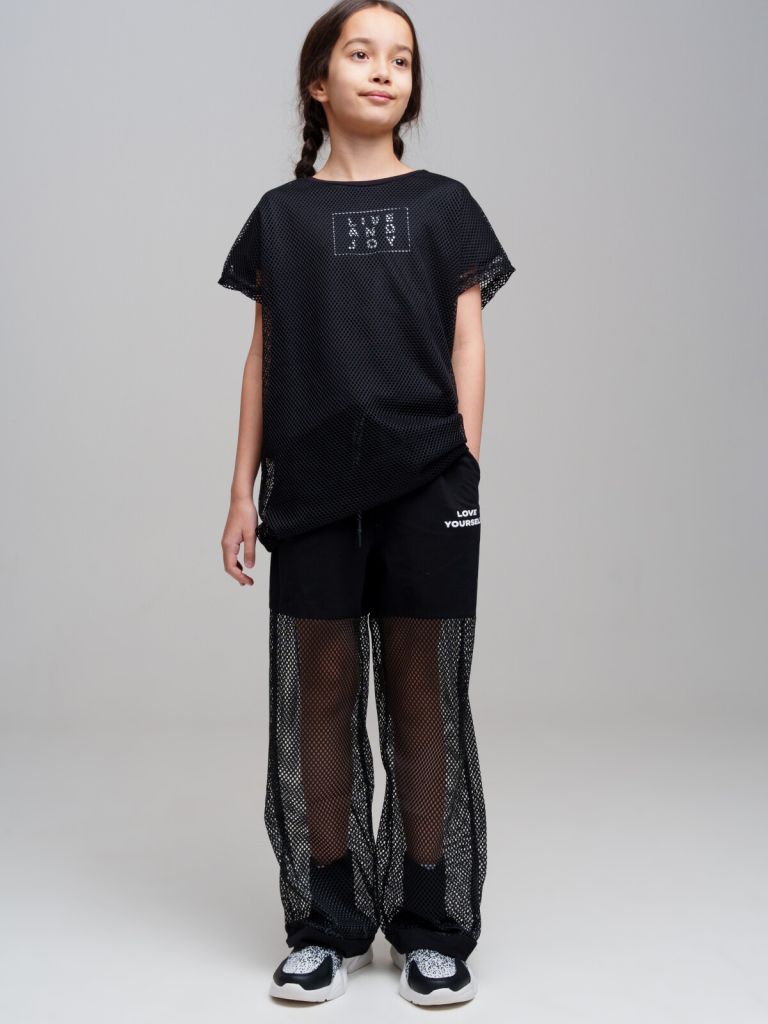 Брюки для девочки подростка. Штаны на резинке со шнурком. Высокое содержание хлопка. Удобные боковые карманы. Декор из сетки. Модель выполнена из качественного и приятного на ощупь трикотажа.