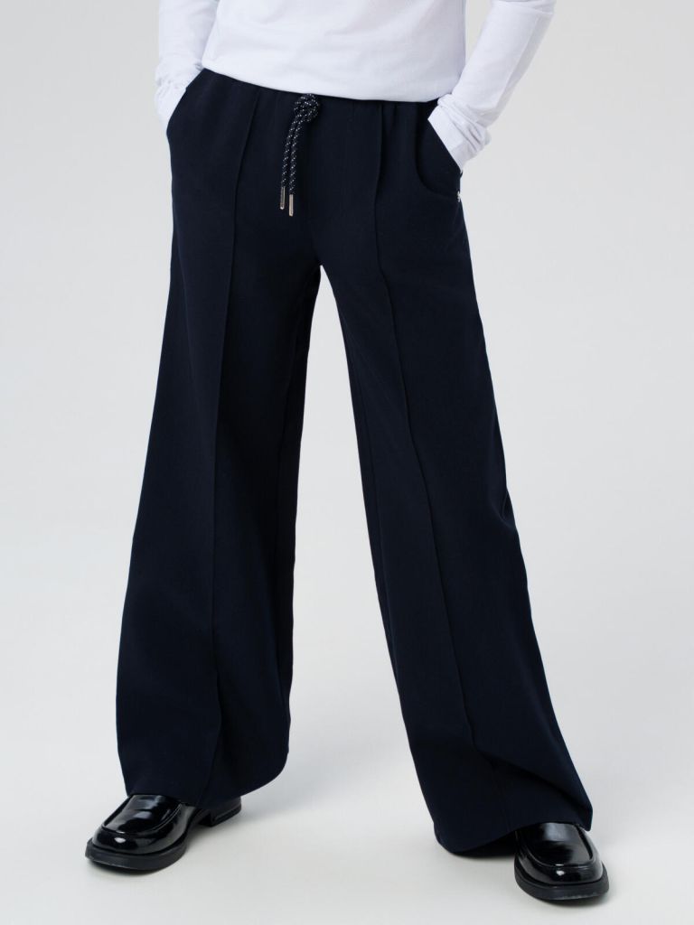 Свободный крой со слегка зауженными брючинами и высокая посадка создают современный и удобный силуэт. Пояс на мягкой резинке со шнурком легко регулируется по фигуре, обеспечивая идеальную посадку. Практичные боковые карманы удобны для хранения необходимых мелочей.