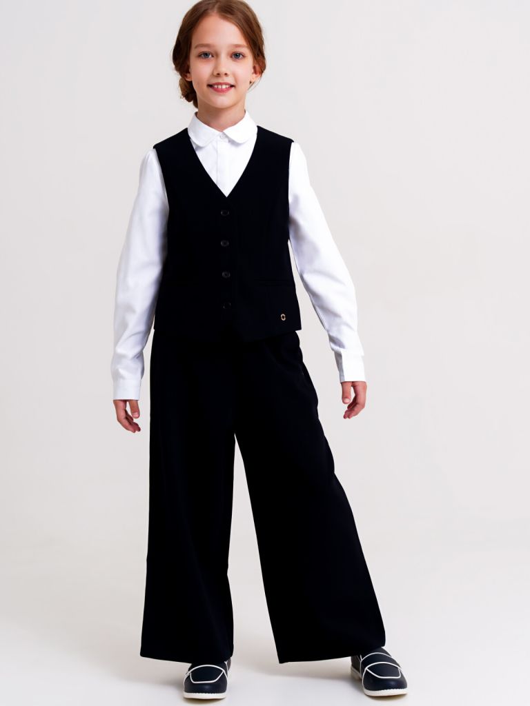 Школьные текстильные брюки-кюлоты для девочки подростка. Брюки-кюлоты (штаны) свободного силуэта (свободные) идеально подойдут в школу. Классические синие брюки для школы выполнены из ткани non-iron, которая не требует глажки после стирки. Брюки с поясом на резинке со шнурком имеют функциональные карманы в боковых швах, что очень удобно для школьницы.
