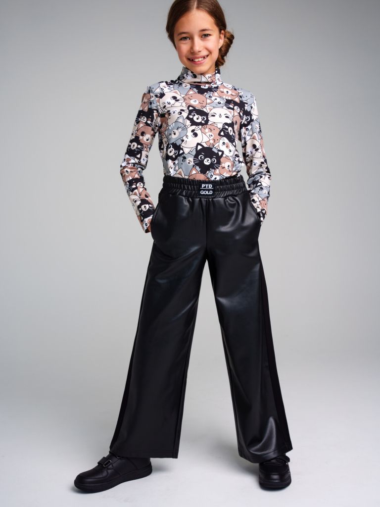 Брюки из искусственной кожи. Лампасы из трикотажа. Модель свободного кроя с широкими штанинами. Карманы в боковых швах. Широкий эластичный пояс.