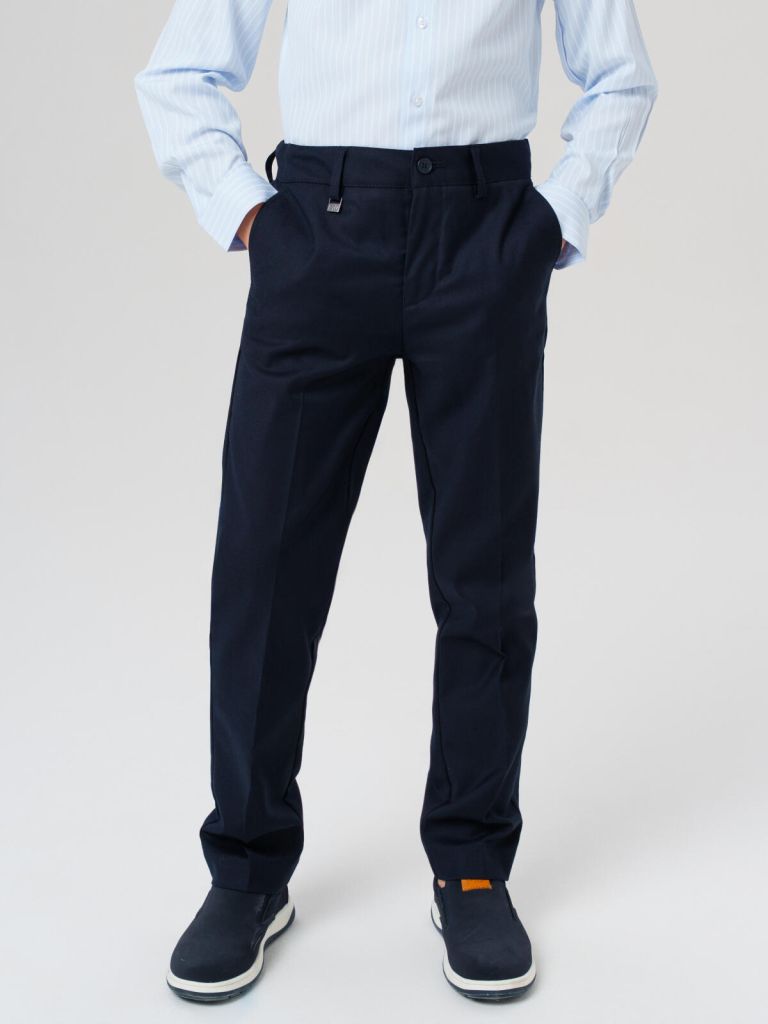 Школьные текстильные брюки для мальчика подростка. Брюки (штаны) облегающего силуэта идеально подойдут в школу. Классические синие брюки для школы выполнены из костюмной ткани с содержанием вискозы, что обеспечивает максимальный комфорт во время занятий. Брюки имеют функциональные карманы в боковых швах, что очень удобно для школьника. Застежка на молнию и пуговицу. Внутренняя утяжка по поясу.