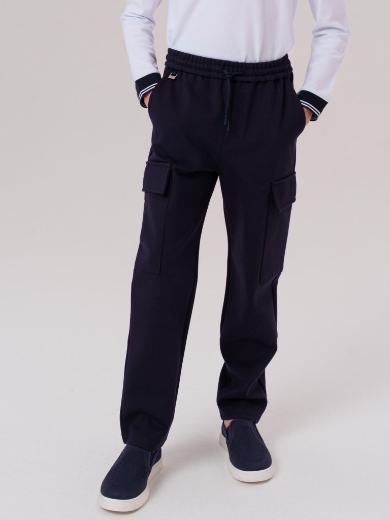 Практичный тёмно-синий цвет и аккуратный крой делают модель подходящей как для школьной формы, так и для повседневной носки. Продуманные детали — шнурок, пояс-резинка, карманы — добавляют функциональности и удобства.