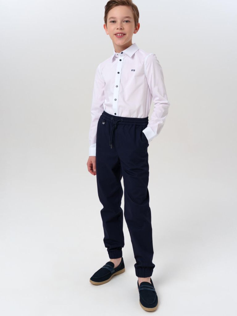 Эти синие подростковые брюки джоггеры для мальчика в школу выполнены из плотного твила с высоким содержанием хлопка. Натуральный материал отлично дышит, дарит комфорт и подходит для активных школьных будней. Лёгкая добавка спандекса даёт ткани эластичность — универсальные брюки для подростков хорошо садятся по фигуре и не сковывают движений.