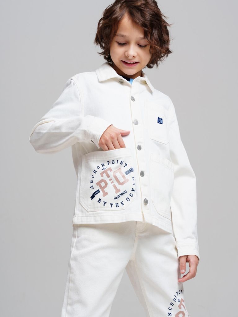 Джинсовка для мальчика подростка. Куртка джинсовая из эластичного денима. Функциональные нагрудный и боковые карманы. Средняя длина. Застежка на болты.