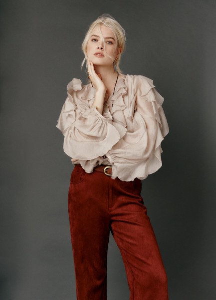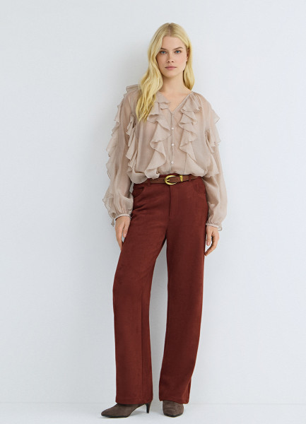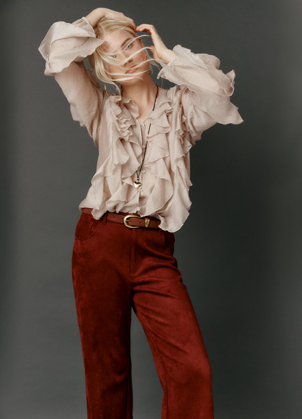 Блузка из жатого бархата с поясом, Коричневый