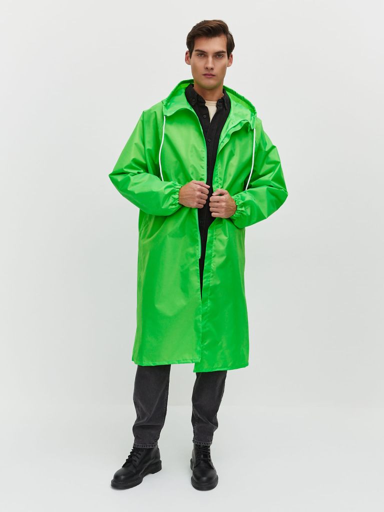 Дождевик сделан из водоотталкивающей прочной ткани, что гарантирует его износостойкость и долговечность.