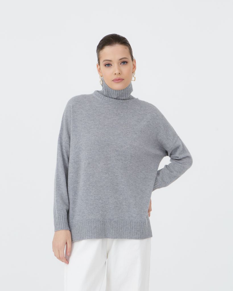 Этот джемпер идеально подходит для создания повседневных образов, а универсальный серо-голубой оттенок легко сочетается с различными элементами гардероба, от классических брюк до джинсов. Высокий воротник не только придает элегантности, но и защищает от прохладного ветра.