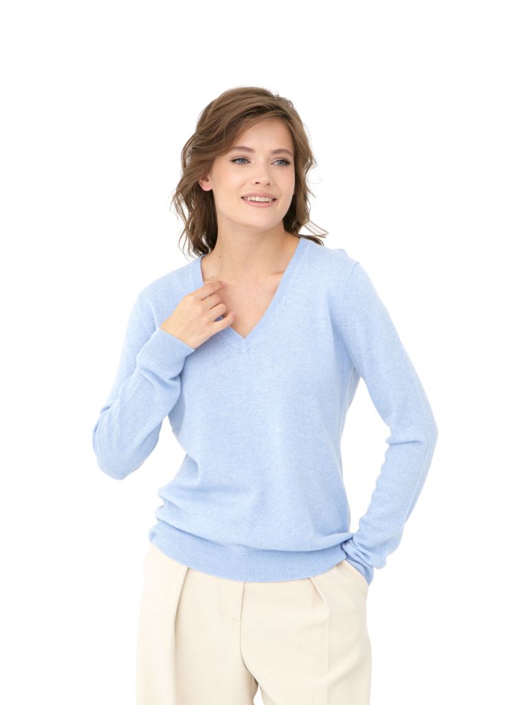 Голубой джемпер из кашемира с V-образным вырезом – это идеальное сочетание элегантности и комфорта. Выполненный из 100% кашемира, он обеспечивает мягкость и тепло, даря ощущение уюта даже в прохладные дни. V-образный вырез добавляет изделию женственности и изящества, делая его универсальным элементом вашего гардероба.