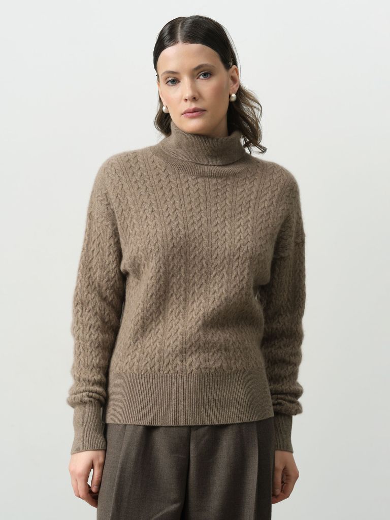 Кашемировый свитер в нежном оттенке капучино – воплощение уютной элегантности и натурального комфорта. Созданный из мягкой смеси монгольского кашемира и шерсти, этот свитер дарит исключительное тепло, оставаясь удивительно лёгким. Природные волокна обеспечивают идеальную терморегуляцию – в таком свитере одинаково комфортно как в прохладный осенний день, так и зимой под пальто.Тонкая вязка и благородный бежево-коричневый оттенок делают эту модель универсальной базой для создания стильных образов. Свободный, но продуманный крой мягко облегает фигуру, сохраняя свободу движений. Свитер идеально сочетается с кожаными юбками, классическими брюками, джинсами-скинни и даже поверх платьев-миди, легко трансформируясь из повседневного в более нарядный вариант.Главные преимущества этой модели – её практичность и долговечность. Натуральный кашемир с годами носки становится только мягче, сохраняя форму и благородный внешний вид. Это экологичный выбор для тех, кто ценит осознанное потребление без ущерба для стиля. Добавьте в свой гардероб эту кашемировую классику – универсальную, комфортную и вневременную.