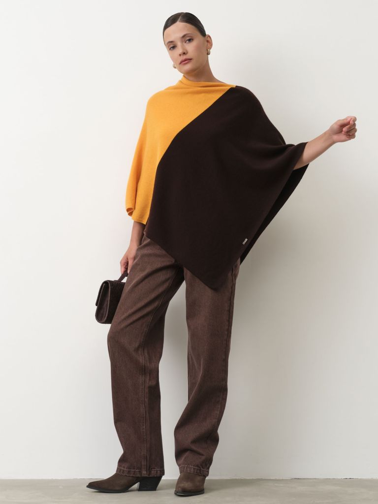Стильное кашемировое пончо с эффектным двухцветным дизайном — сочетанием глубокого шоколадного и яркого горчичного оттенков. Лёгкий асимметричный крой с диагональной линией деления цветов создаёт динамичный и современный силуэт. Мягкий и тёплый кашемир обеспечивает комфорт и уют, оставаясь при этом воздушным и невесомым. Универсальная модель идеально подойдёт для создания ярких акцентов в повседневных и вечерних образах, легко сочетаясь с брюками, джинсами или юбками.