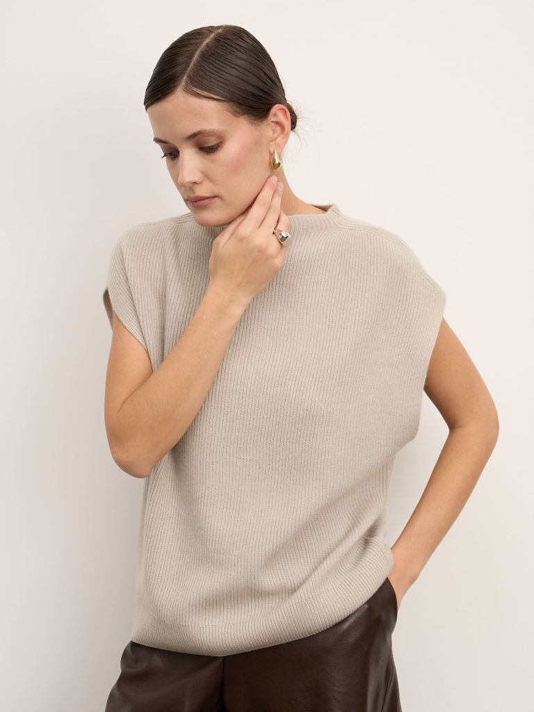 Лаконичный джемпер из 100% кашемира с мягкой фактурой и современным минималистичным силуэтом. Модель без рукавов с аккуратной круглой горловиной и свободной посадкой — легко сочетается с базовым и деловым гардеробом.Состав: 100% кашемирЦвет: серебристый (нейтральный тёплый серо-бежевый)Крой: прямой, свободный; без рукавовГорловина: круглаяКомфорт: мягкий на ощупь, не колется, гипоаллергенныйПрактичность: держит форму, лёгкий и тёплыйРазмеры в наличии: M, L, XL, XXLАртикул: 04-24-200-0CС чем носитьСочетайте с кожаными или шерстяными брюками, джинсами, а также с юбками миди. Носите соло или поверх тонкой рубашки — для стильной многослойности.УходДеликатная стирка при 30°C средствами для шерсти или химчисткаСушка на горизонтальной поверхности, вдали от тепла и солнцаХранить сложенным, не на вешалке