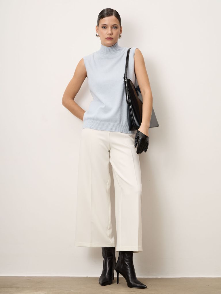Женский джемпер без рукавов из натурального кашемира в нежном аквамариновом оттенке. Лаконичный дизайн с высоким воротником-стойкой подчёркивает элегантность модели и делает её универсальной для многослойных образов.