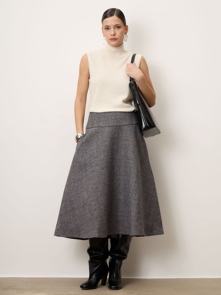 Прямой силуэт, аккуратный воротник-стойка, гладкая вязка. Минималистичный стиль подчёркивает качество материала и чистоту линий.