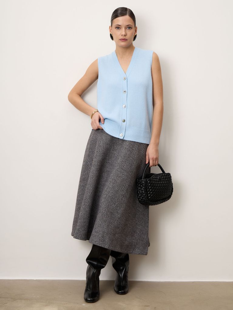 Женский жилет из 100% монгольского кашемира в нежном голубом оттенке. Исключительно мягкий, лёгкий и тёплый благодаря тонкому волокну 15–16 микрон. Идеален для многослойных образов благодаря V-вырезу и ровной вязке. Премиальная вещь, которая остаётся актуальной многие сезоны.