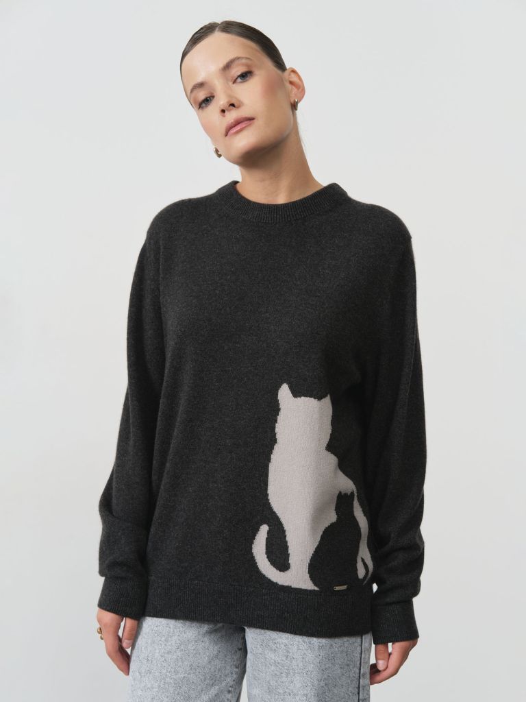 Женский джемпер из натурального кашемира с выразительным жаккардовым рисунком в виде силуэта кошки. Модель сочетает минимализм и художественный акцент, создавая уютный и стильный образ для повседневного гардероба.