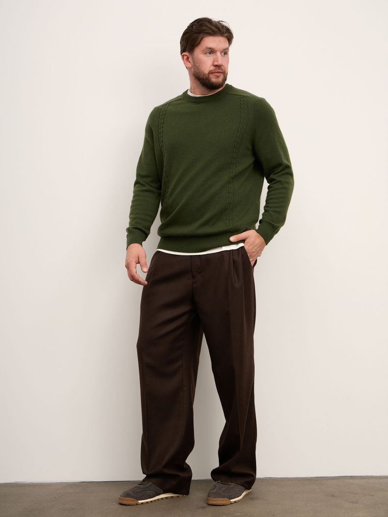 Классический мужской джемпер из 100% кашемира — сочетание элегантности, тепла и природного комфорта. Модель с круглым вырезом и прямым кроем подчёркивает лаконичный стиль и подходит как для повседневных, так и для деловых образов.Состав: 100% кашемирЦвет: глубокий зелёныйКрой: прямой, классическийГорловина: круглая, эластичнаяРукава: длинные, с мягкими манжетамиКомфорт: лёгкий, тёплый, приятный к телуС чем носитьУниверсальный базовый вариант, который отлично сочетается с брюками из шерсти, твида или денима. Можно надевать поверх рубашки или под пиджак — для завершённого осенне-зимнего образа.УходРекомендуется деликатная стирка при 30°C или химчисткаСушка на горизонтальной поверхности, без отжимаХранить сложенным, вдали от прямых солнечных лучей