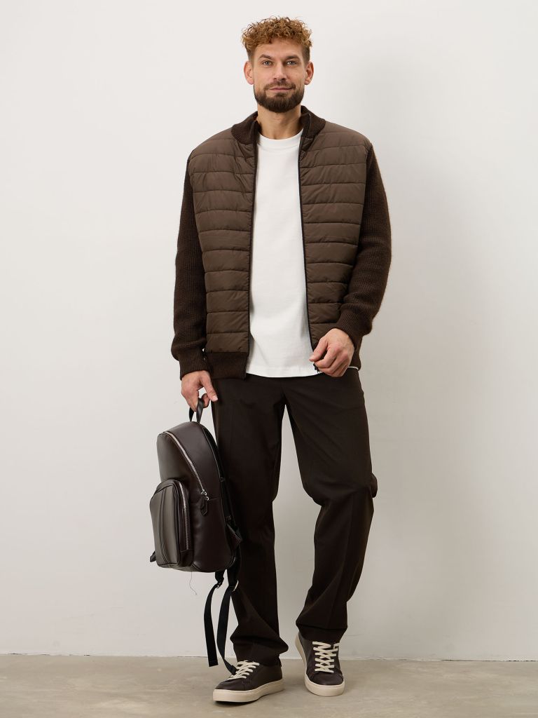 Прямой силуэт с комбинированной конструкцией. Перед выполнен из стёганого материала с наполнителем из верблюжьей шерсти — он держит форму и визуально выглядит более собранно. Спинка и рукава — из плотного трикотажа на основе пуха яка, мягкие и слегка эластичные. Высокий воротник-стойка закрывает шею, застёжка на молнии позволяет регулировать тепло.