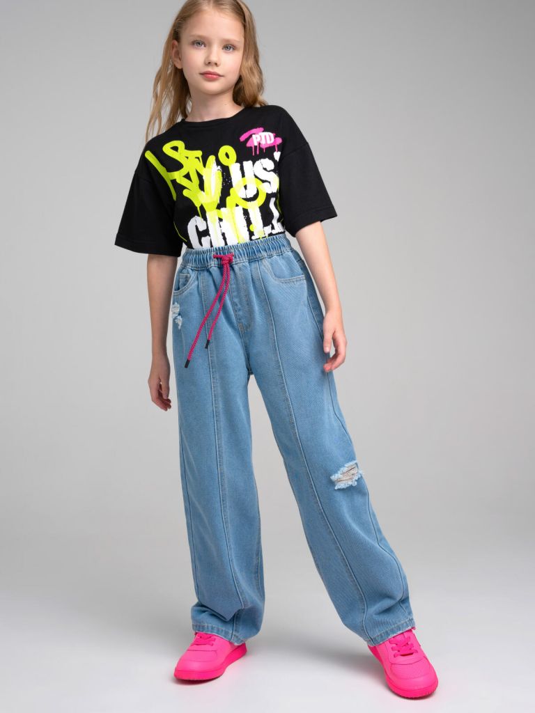 Джинсы для девочки подростка. BAGGY FIT - модный расслабленный крой. Средняя посадка. Джинсы на резинке со шнурком. 5 карманов. Модные элементы потертости и порванности.