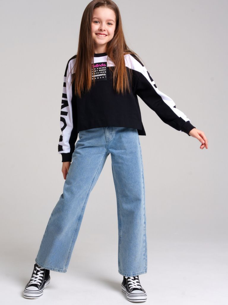Джинсы для девочки. Застежка на пуговицу, пояс с внутренней утяжкой. Крой Wide leg ― это свободная посадка и расклёшенные от бедра штанины. Высокая посадка.
