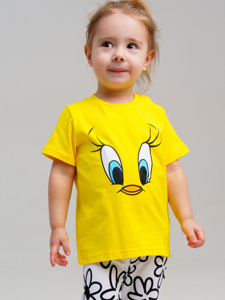 Футболка детская для девочки. Высокое содержание хлопка. Благодаря наличию эластана в составе ткани изделие держит форму и меньше мнется. Застежка на кнопки на плече. Модель выполнена из качественного и приятного на ощупь трикотажа.