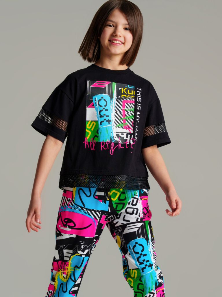 Футболка oversize из качественного и приятного на ощупь трикотажа джерси. Высокое содержание хлопка 95%. Благодаря наличию эластана в составе ткани изделие проще в уходе и держит форму. Рукава и низ футболки декорированы сеткой.