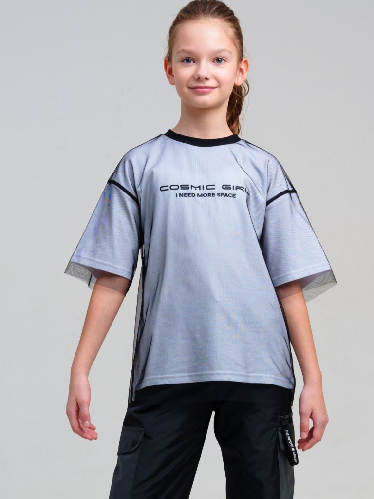 Футболка для девочки подростка. Футболка оверсайз из качественного и приятного на ощупь трикотажа джерси с высоким содержанием хлопка 95%. Благодаря наличию эластана в составе ткани изделие проще в уходе и держит форму. Декор из сетки. Модель выполнена из качественного и приятного на ощупь трикотажа.