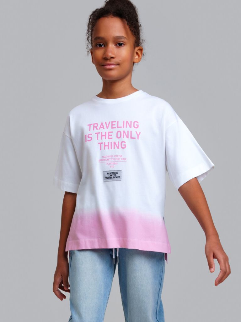Футболка оверсайз для девочки подростка. Высокое содержание хлопка. Благодаря наличию эластана в составе ткани изделие держит форму и меньше мнется. Модель выполнена из качественного и приятного на ощупь трикотажа.