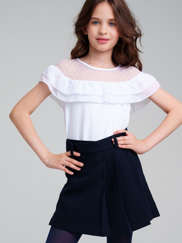 Школьная белая футболка - прекрасная альтернатива рубашке в школу. Минималистичный дизайн и приталенный силуэт модели делает футболку базовым элементом для комфортного повседневного гардероба девочки подростка. Высокое содержание хлопка 95%. Благодаря наличию эластана в составе ткани футболка для школы проще в уходе и отлично держит форму. Футболка для школы с декором из сетки и воланов разнообразит повседневные образы школьницы. Застежка сзади на пуговицу.