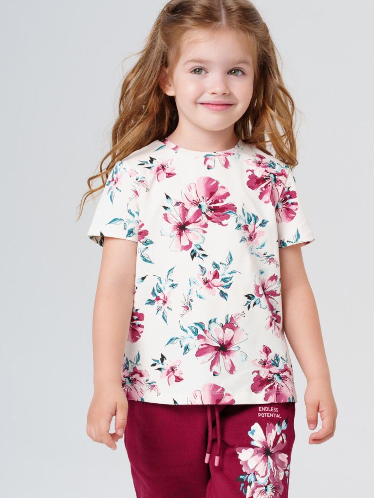 Нарядная и удобная футболка для девочки с цветочным принтом от PlayToday — стильное решение для детского сада, прогулок и праздников.
