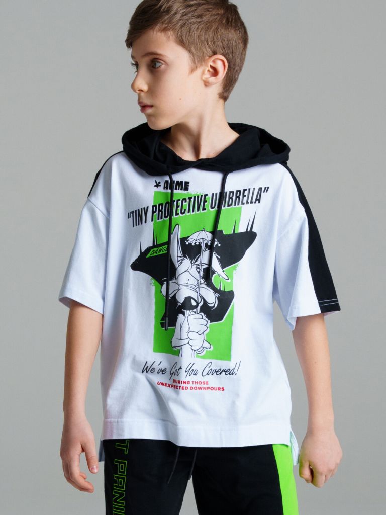 Футболка oversize из качественного и приятного на ощупь трикотажа джерси. Капюшон с утяжкой шнурком. Высокое содержание хлопка 95%. Благодаря наличию эластана в составе ткани изделие проще в уходе и держит форму.