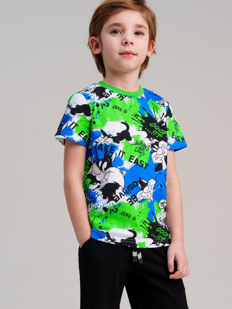 Футболка детская для мальчика. Высокое содержание хлопка. Благодаря наличию эластана в составе ткани изделие держит форму и меньше мнется. Модель выполнена из качественного и приятного на ощупь трикотажа.