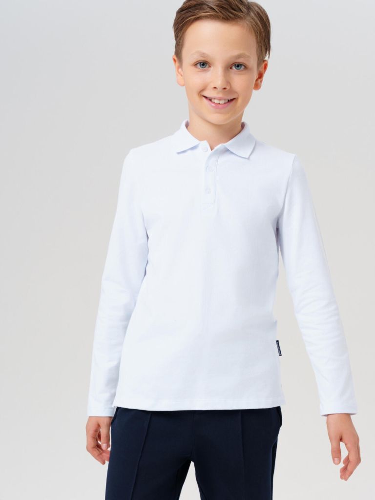 Школьная белая футболка поло с длинным рукавом для мальчика подростка от PlayToday — стильная альтернатива классической белой рубашке. Лаконичная, удобная и практичная — идеально подходит для школы и повседневных образов.