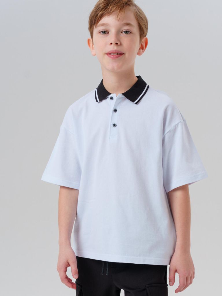 Базовое белое школьное поло оверсайз с коротким рукавом для мальчика от PlayToday — комфорт, стиль и практичность каждый день. Идеально для школы и активных будней.