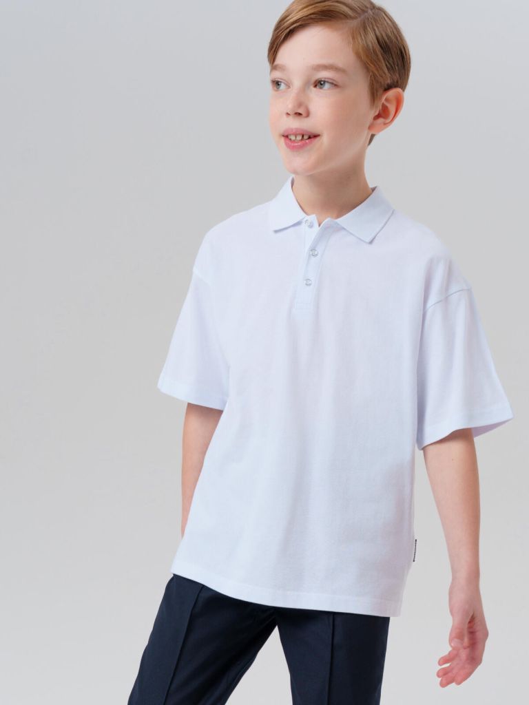 Базовое белое школьное поло оверсайз с коротким рукавом для мальчика от PlayToday — комфорт, стиль и практичность каждый день. Идеально для школы и активных будней.