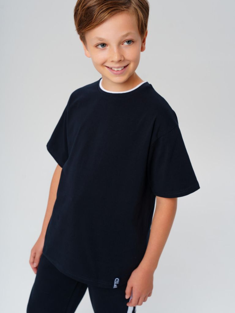 Темно-синяя хлопковая футболка оверсайз с коротким рукавом для мальчика подростка от PlayToday — идеальный выбор для школы, уроков физкультуры, спорта и активных прогулок. Современный крой, универсальный цвет и комфортный материал делают её незаменимой частью гардероба.