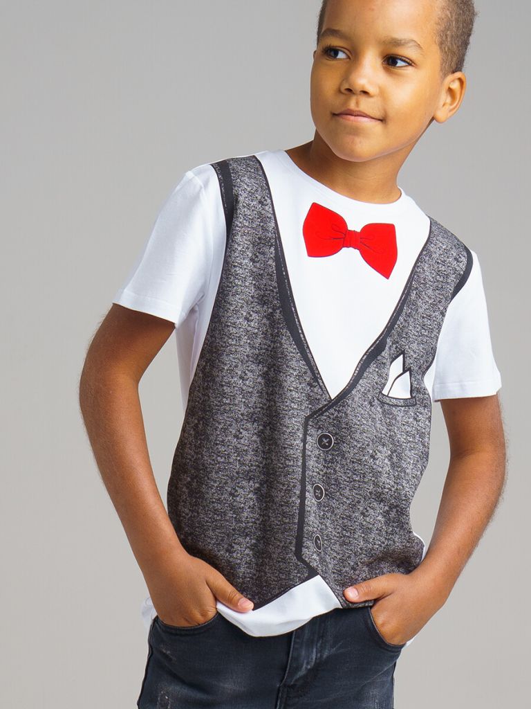 Футболка из качественного приятного на ощупь трикотажа. Высокое содержание хлопка 95%. Благодаря наличию эластана в составе ткани изделие проще в уходе и держит форму. Принт с имитацией жилетки и бабочки. Бабочка тактильная бархатистая. Оригинальное и удобное решение для ребенка в создании праздничного образа.