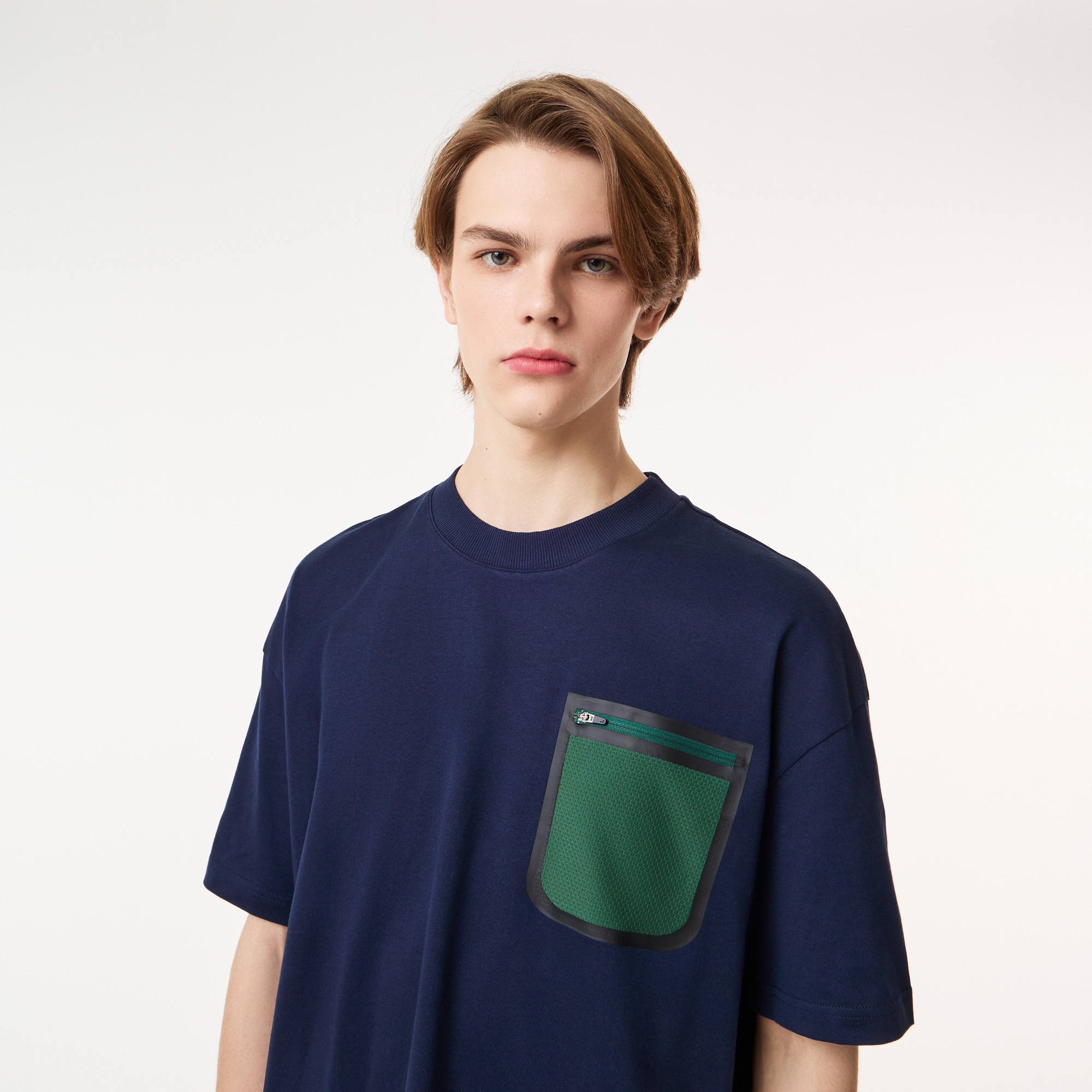 Круглый вырез\Короткие рукава\Спущенная линия плеч\Расцветка colorblock\Карман на молнии на груди\Логотип на нижнем крае\Материал: 100% хлопок\Рост модели 185 см, размер одежды 4-M