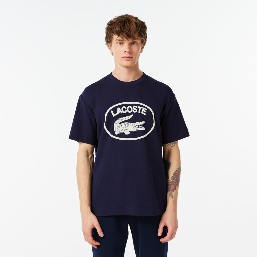 Мужская фирменная хлопковая Футболка Lacoste Relaxed Fit \ Свободный крой, удобный крой, прямые рукава: \ Круглый вырез горловины: \ Надпись тон в тон и крокодил: \ Вышитый крокодил, пришитый сзади: \ Органический хлопок: \ Прямые рукава;\Круглый вырез\М